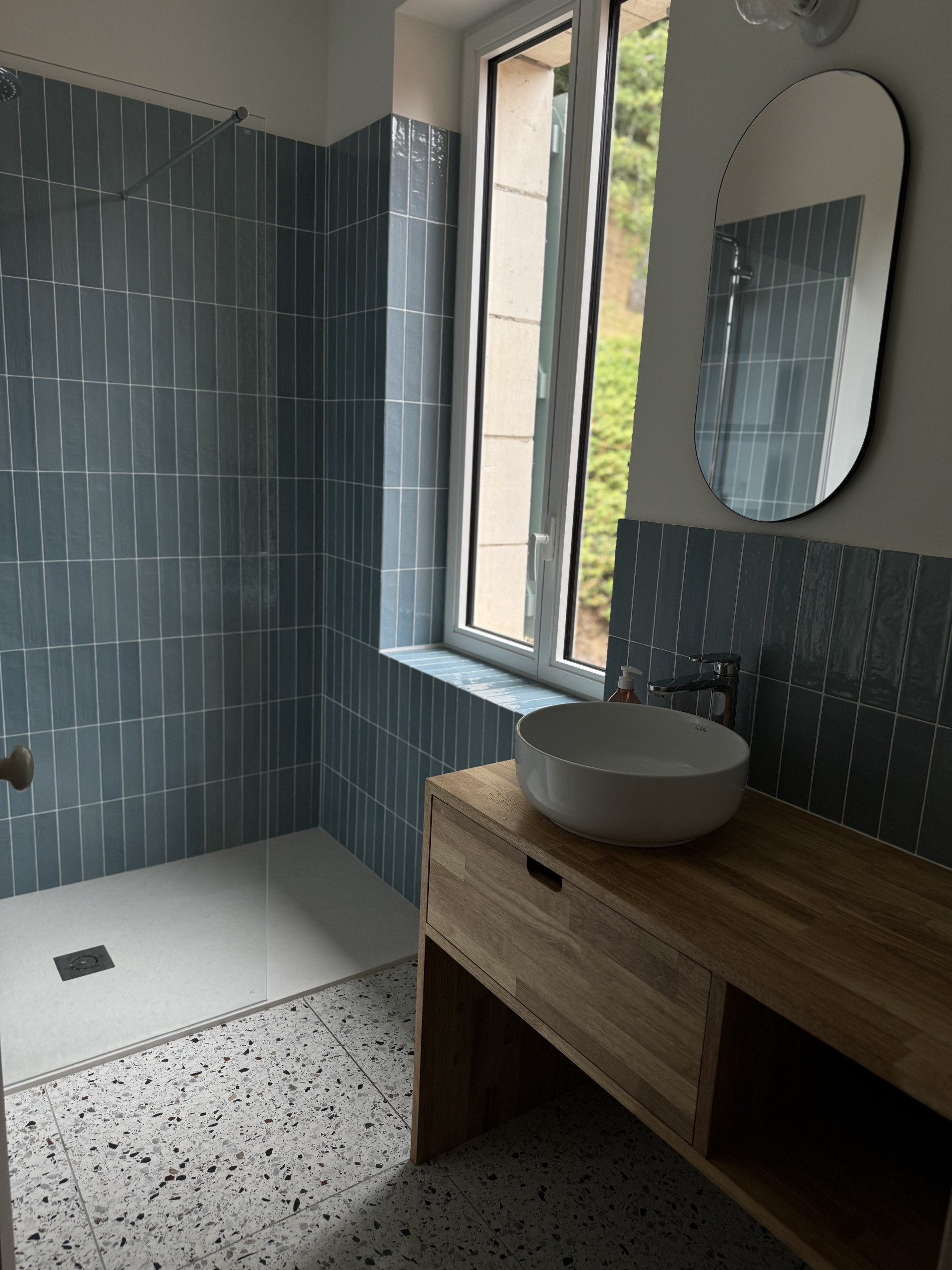 La maison comprend deux salles de bains, l'une avec douche et l'autre avec baignoire dans la suite parentale, offrant tout le confort nécessaire.