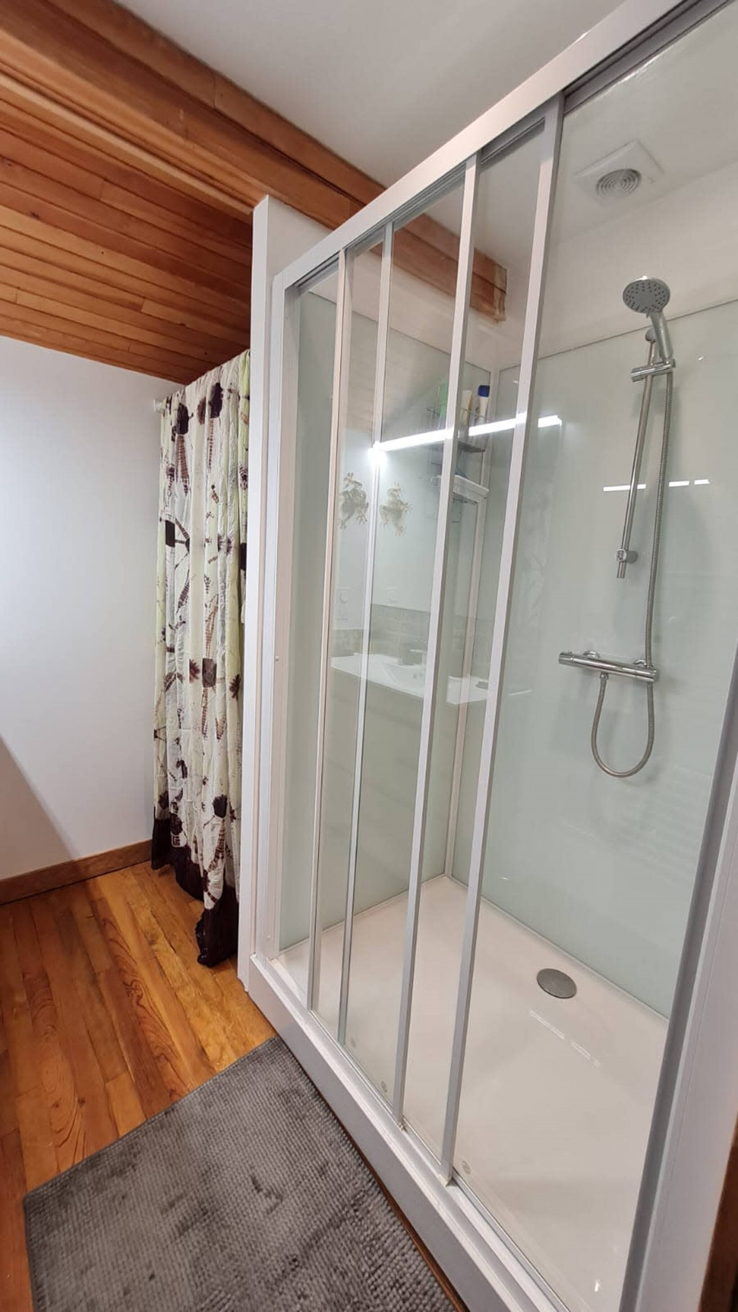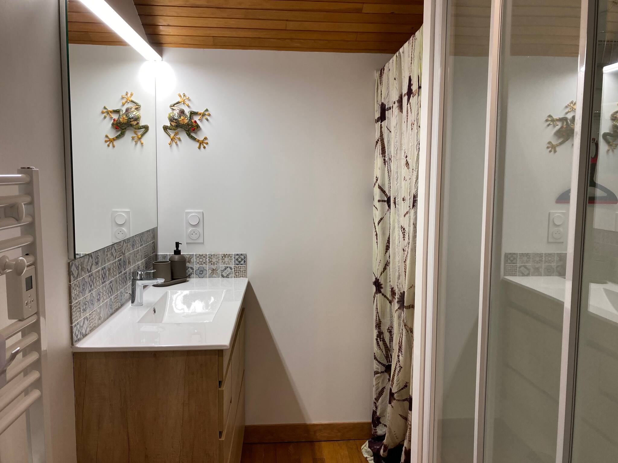 A l'étage, salle d'eau avec wc séparé. 2 chambres, une avec 1 lit en 160 et l'autre avec un lit simple.