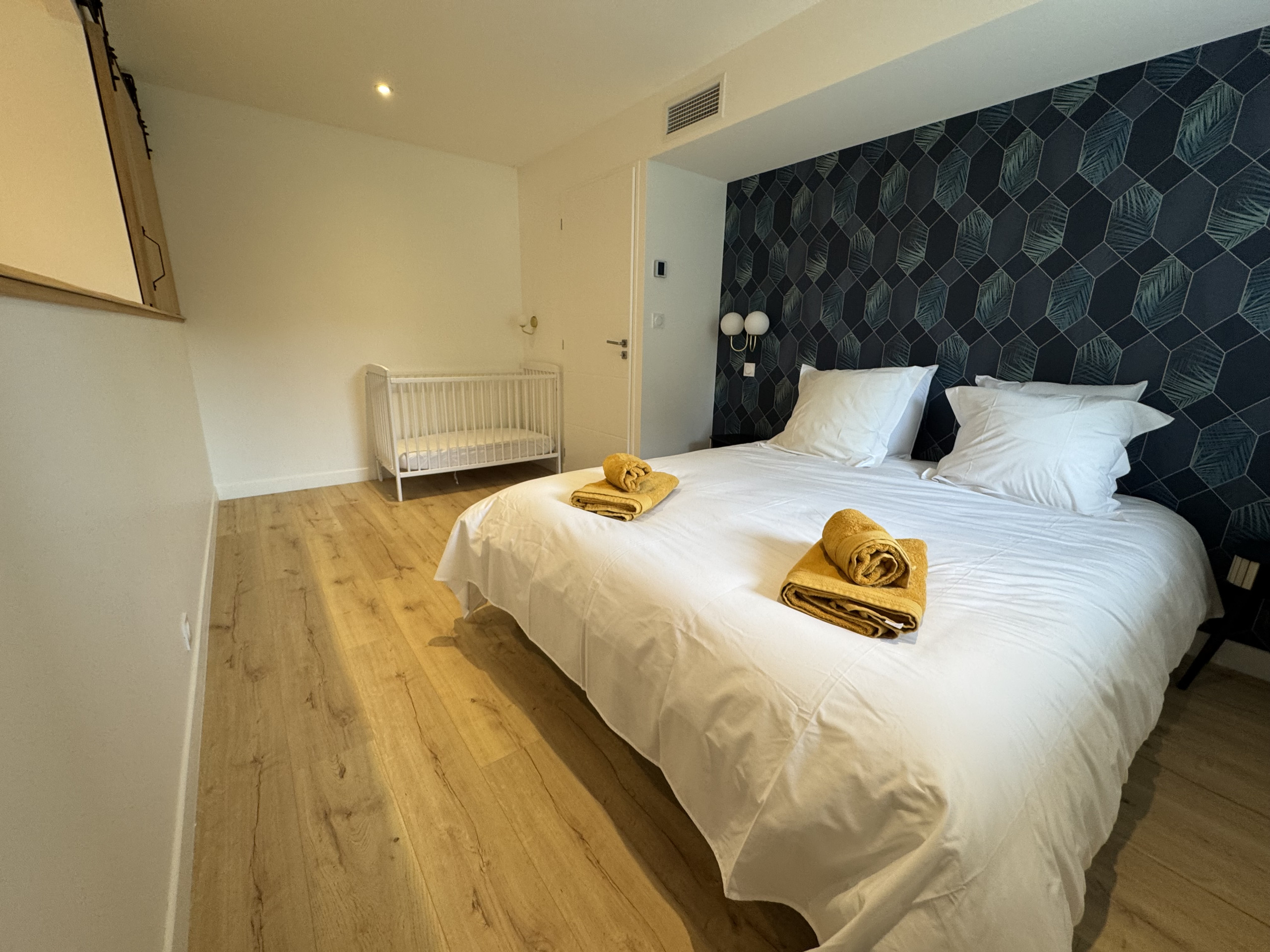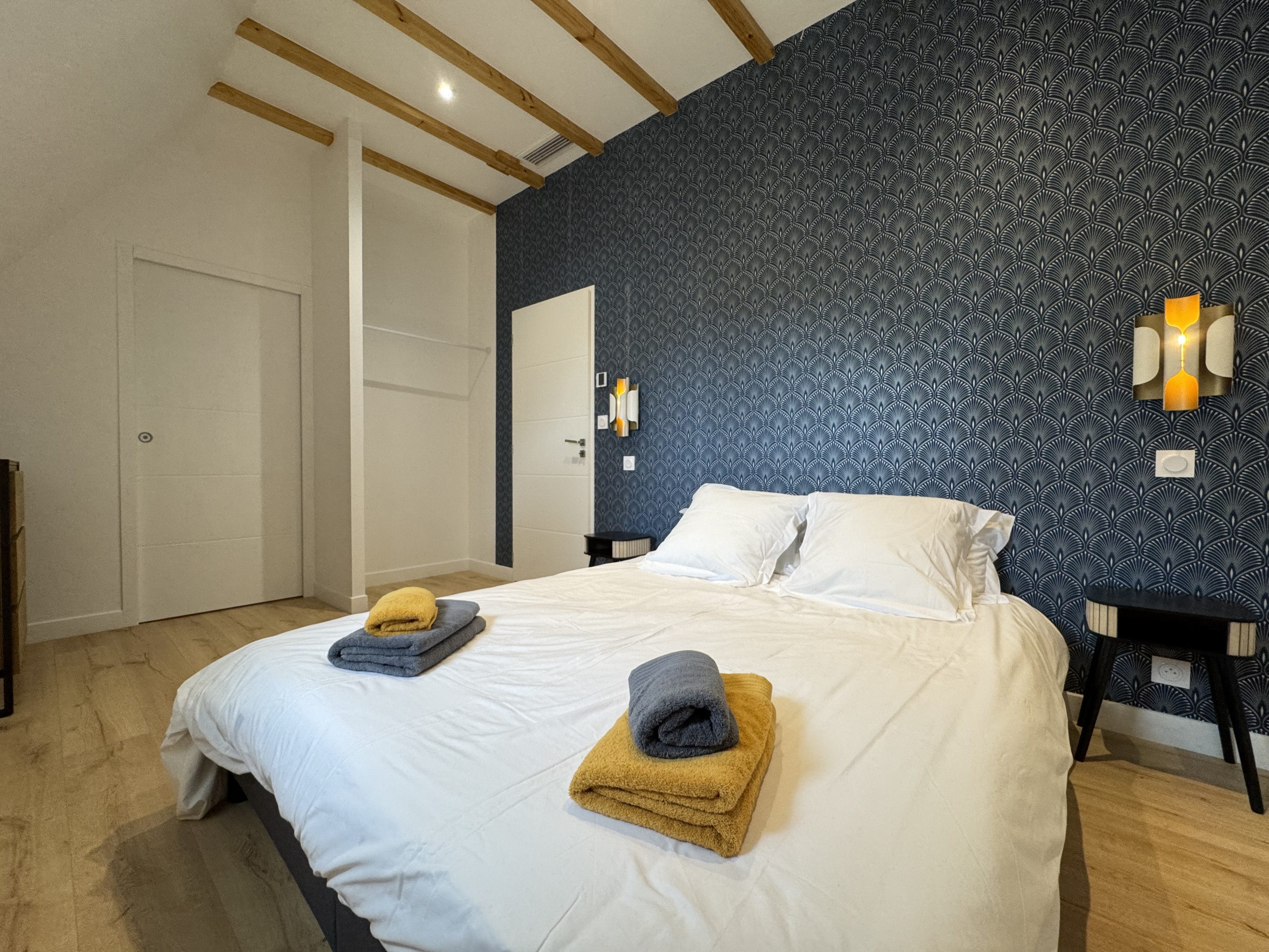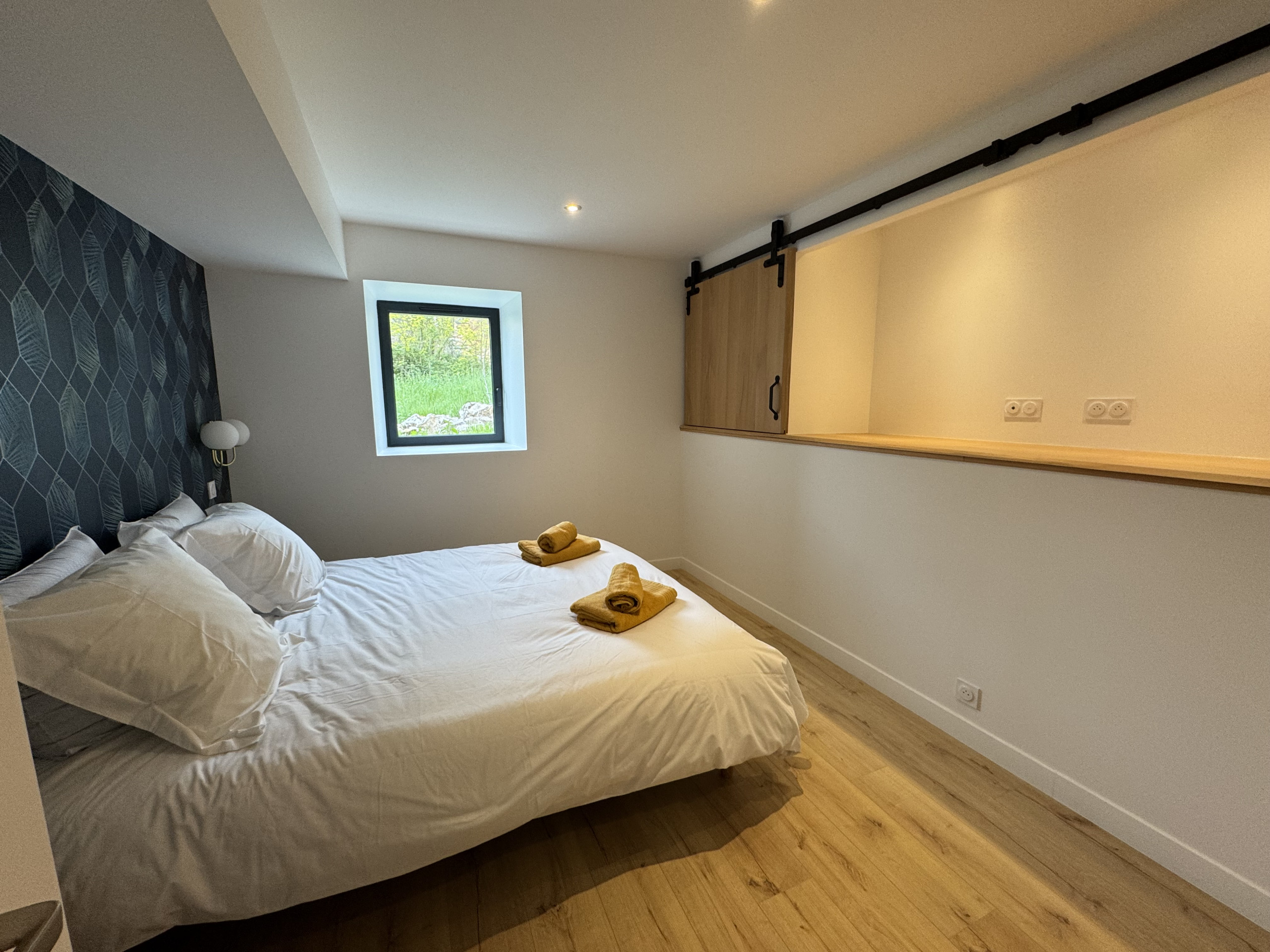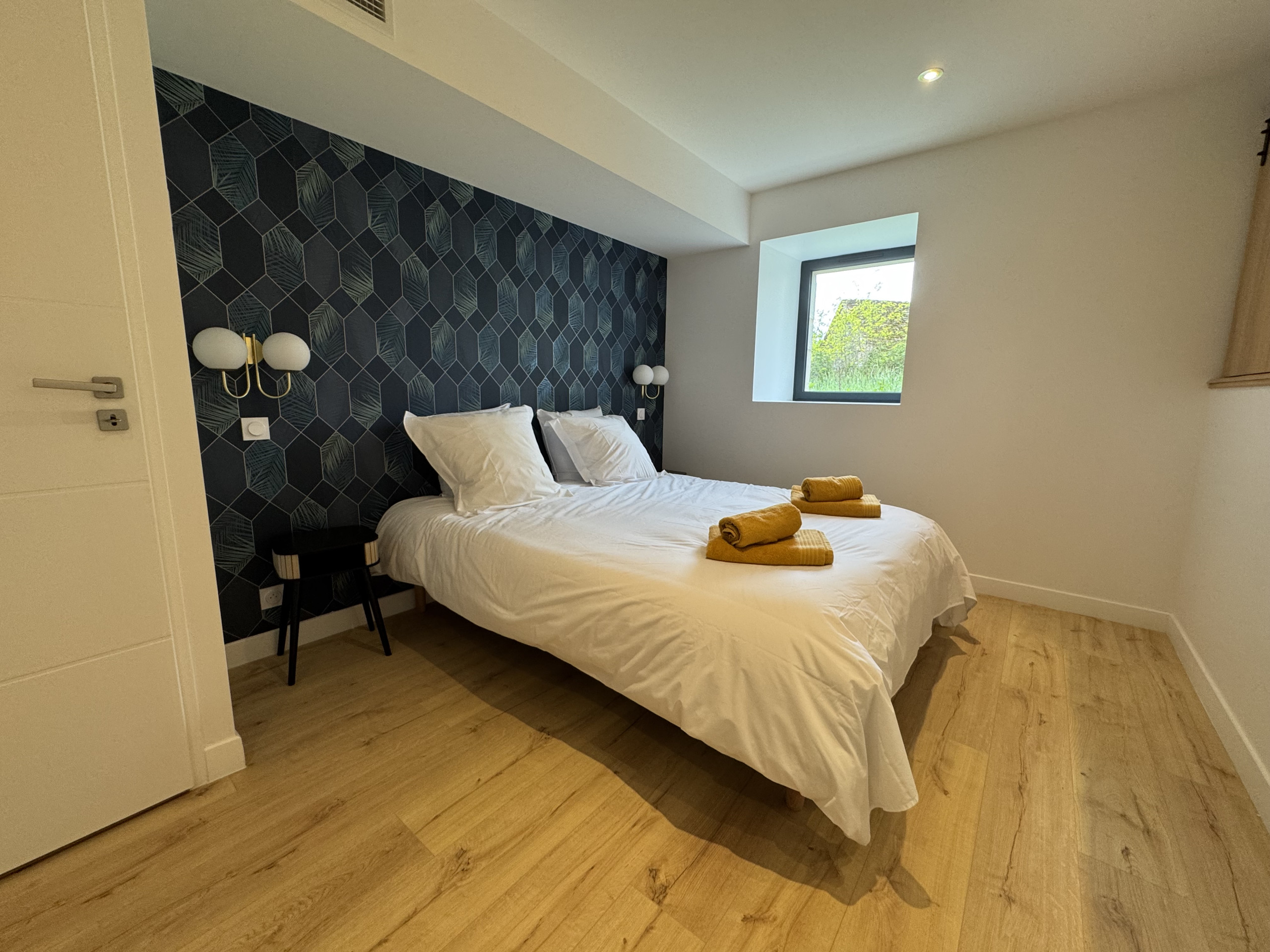quelques marches et vous trouverez 2 chambres équipées de lits en 160 (une dispose d'un lit bébé), salle de bain avec douche / baignoire et wc séparé.