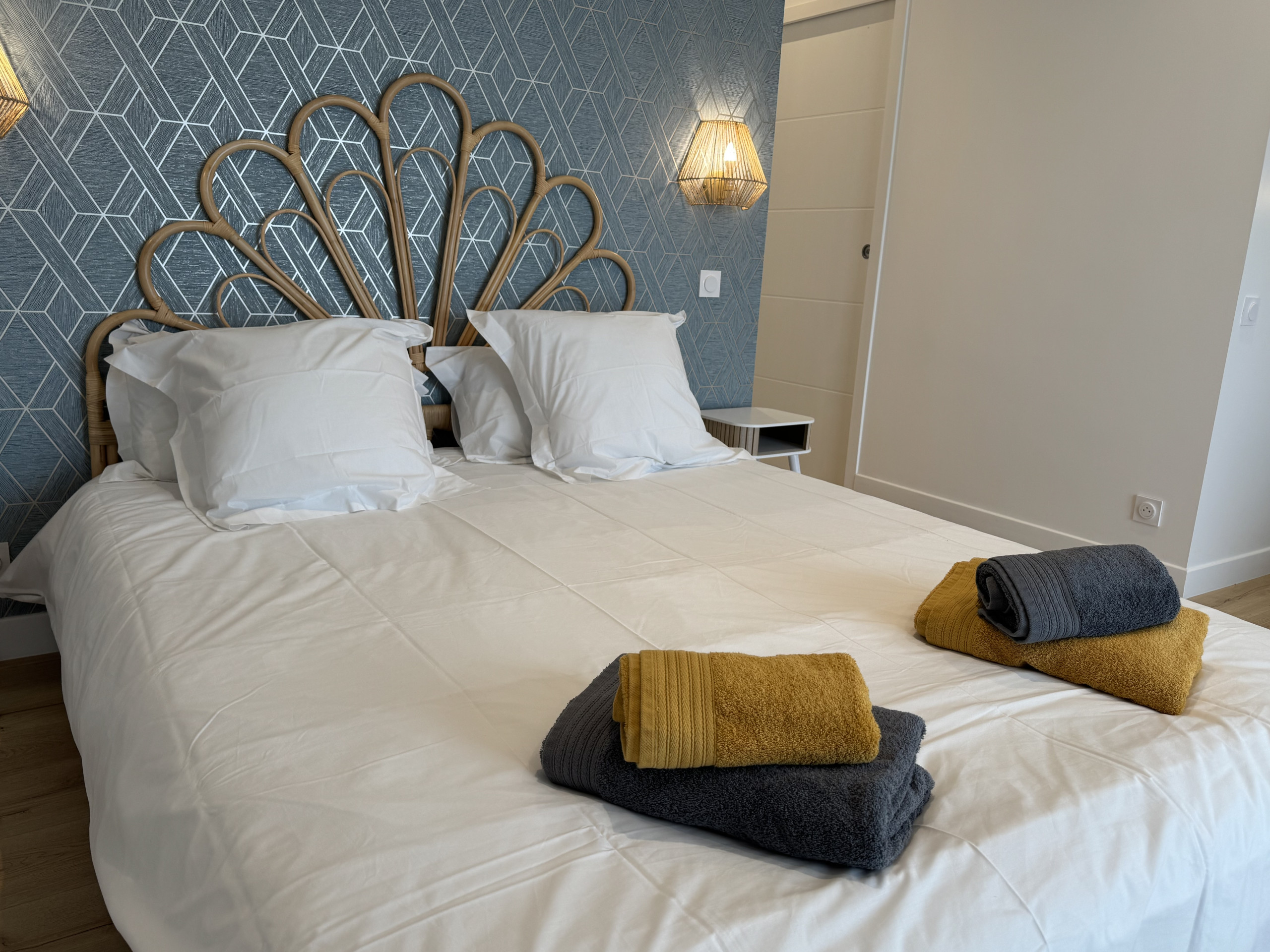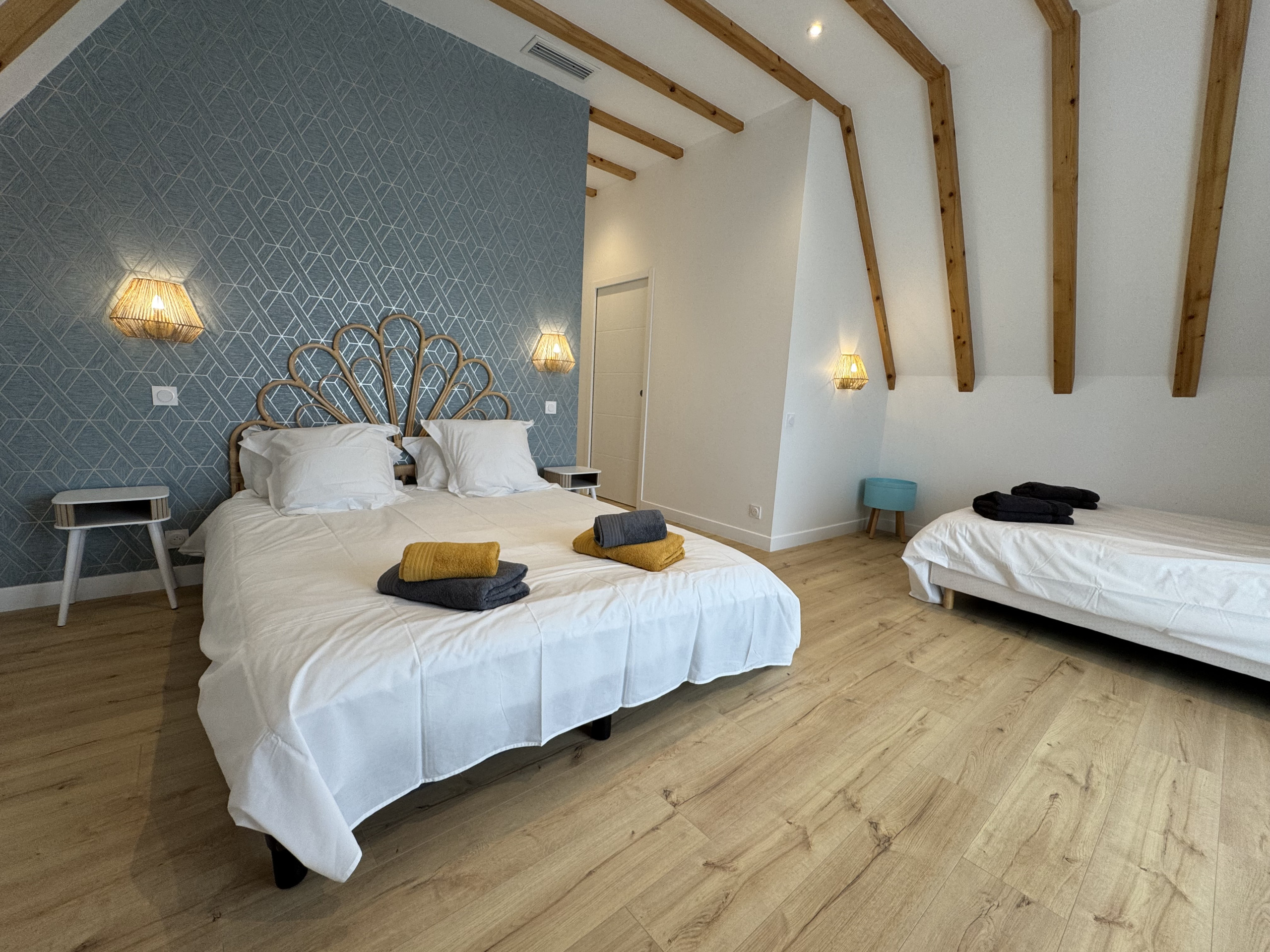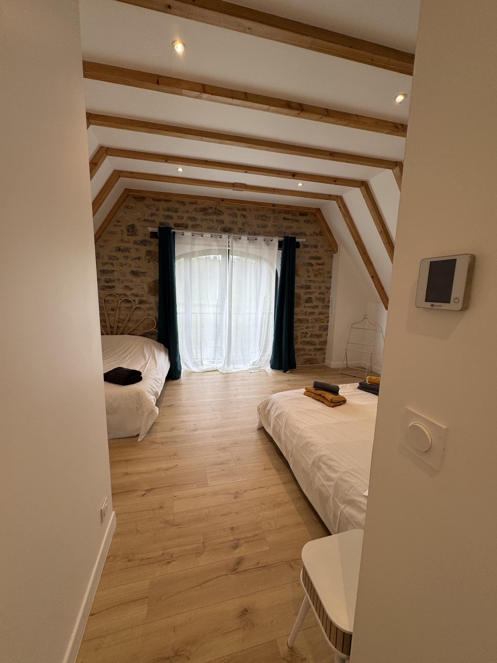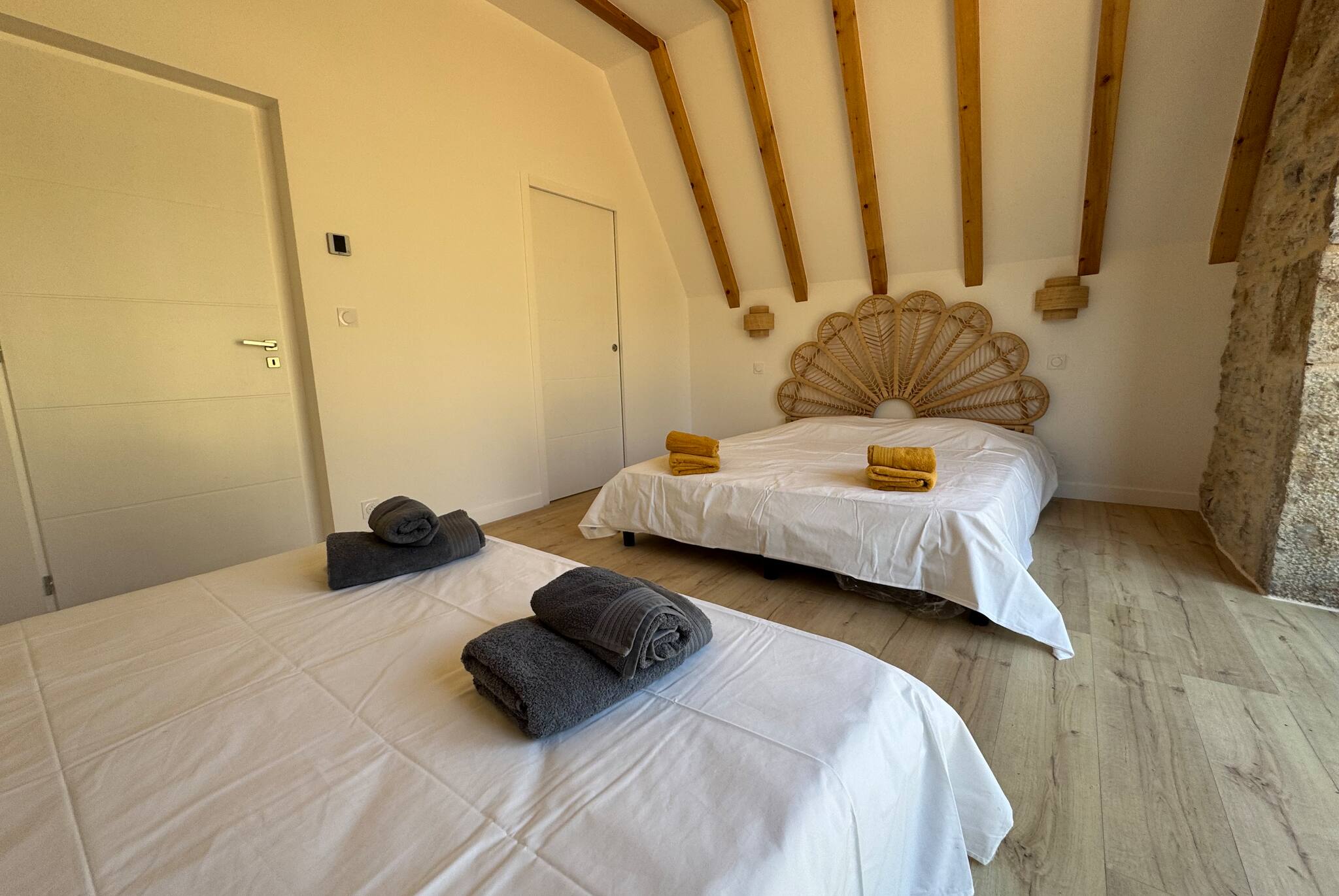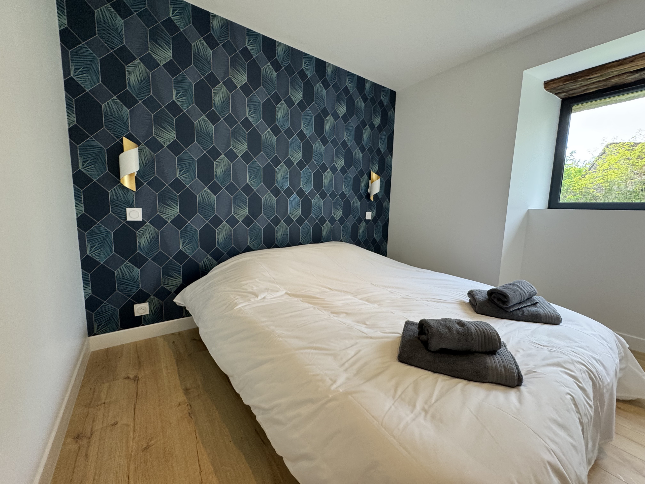 quelques marches et vous trouverez 2 chambres équipées de lits en 160 (une dispose d'un lit bébé), salle de bain avec douche / baignoire et wc séparé.