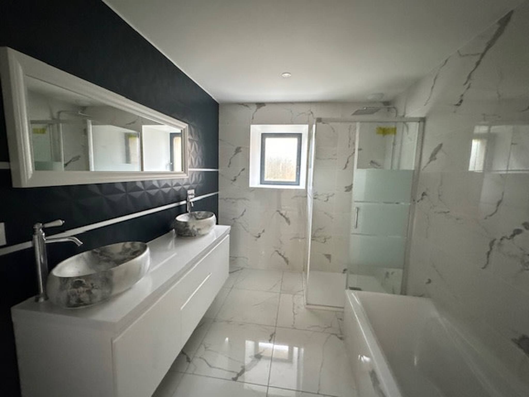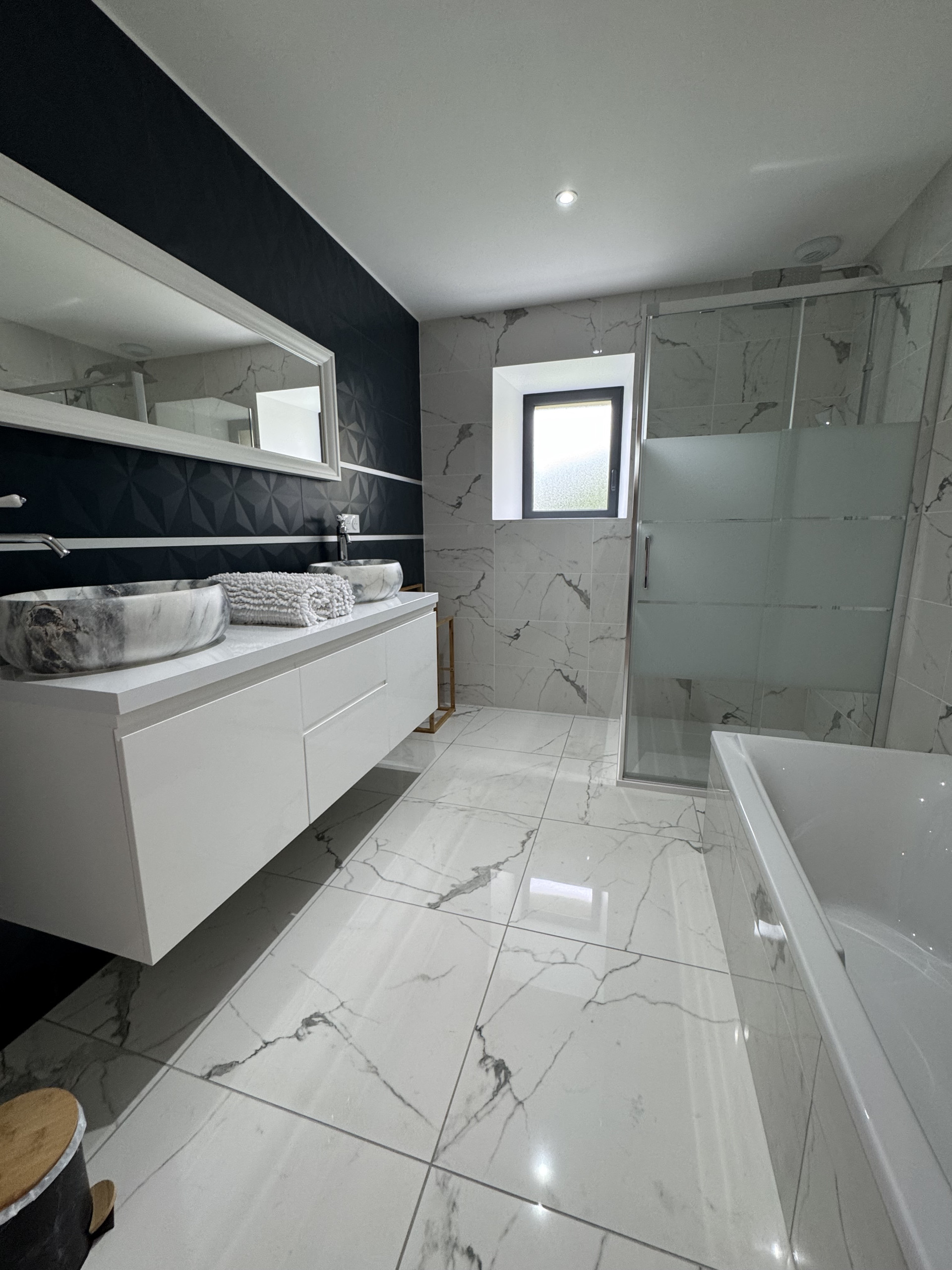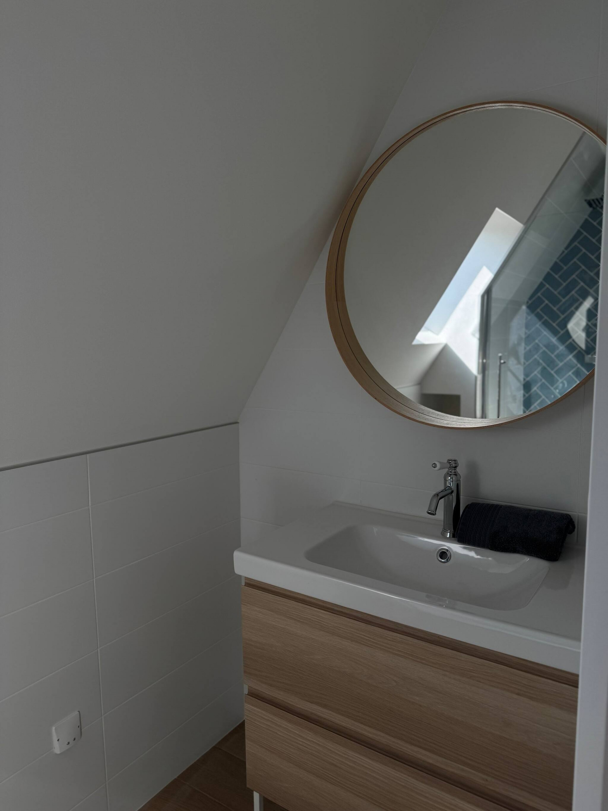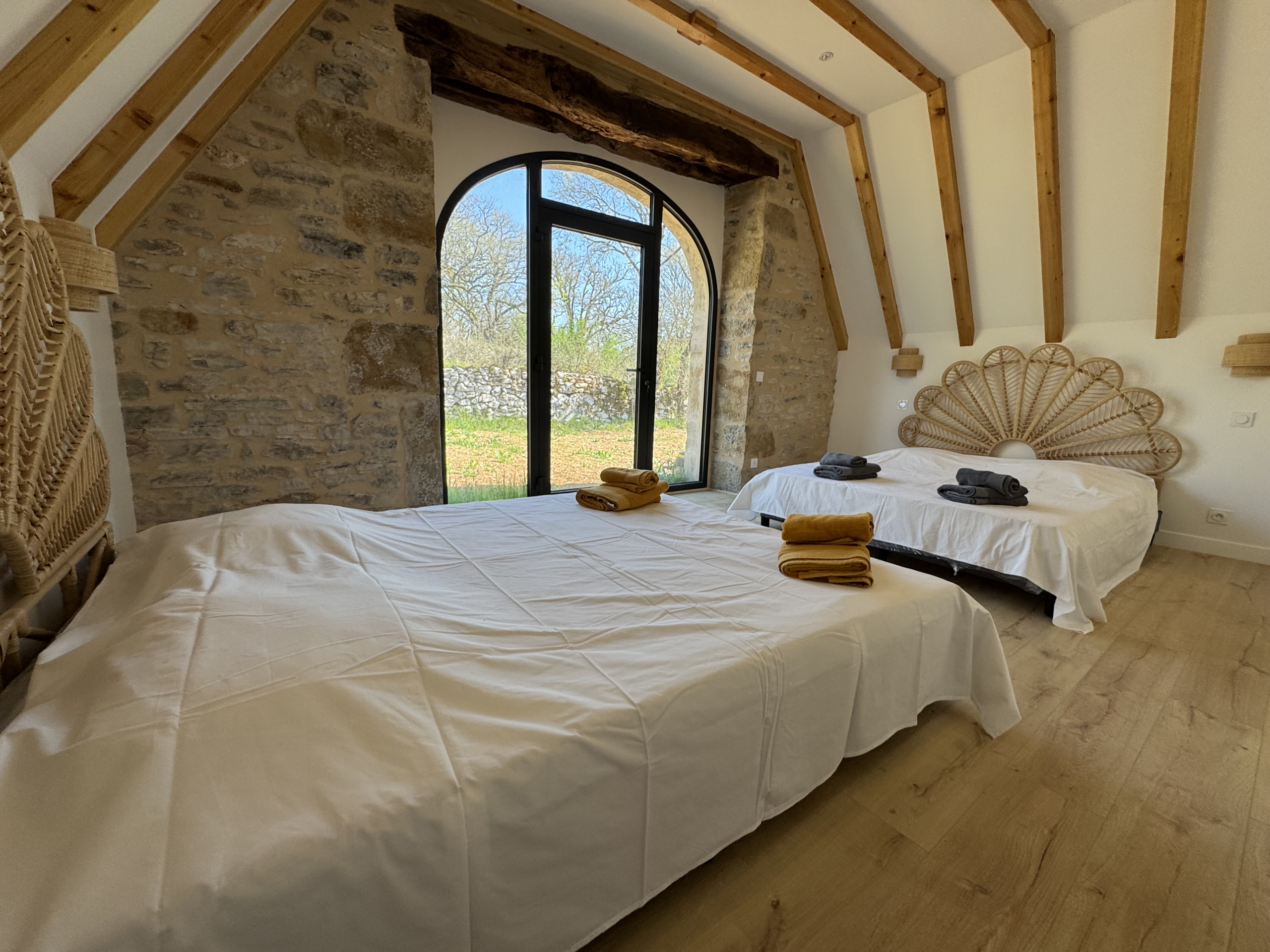 quelques marches et vous trouverez 2 chambres équipées de lits en 160 (une dispose d'un lit bébé), salle de bain avec douche / baignoire et wc séparé.