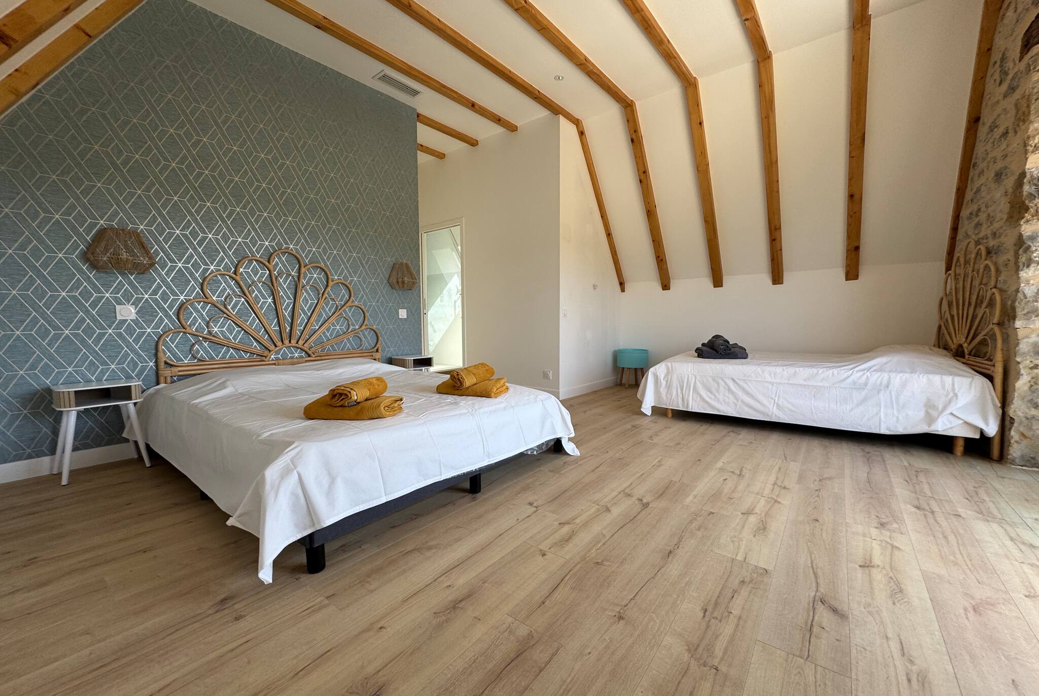 L'étage dispose de 3 chambres: une avec un lit 160, une avec 2 lits 160 et la dernière vue sur la vallée dispose d'un lit 160 et un 140. Des wc sont également disponible.