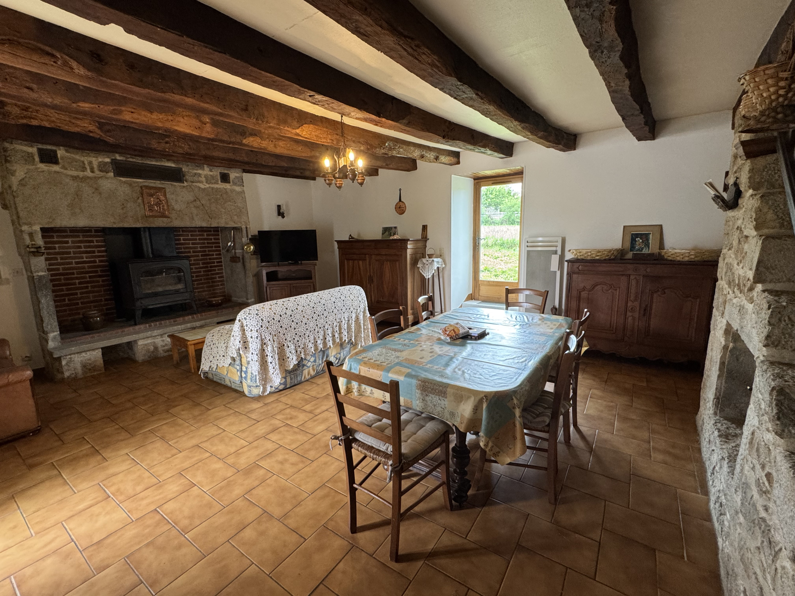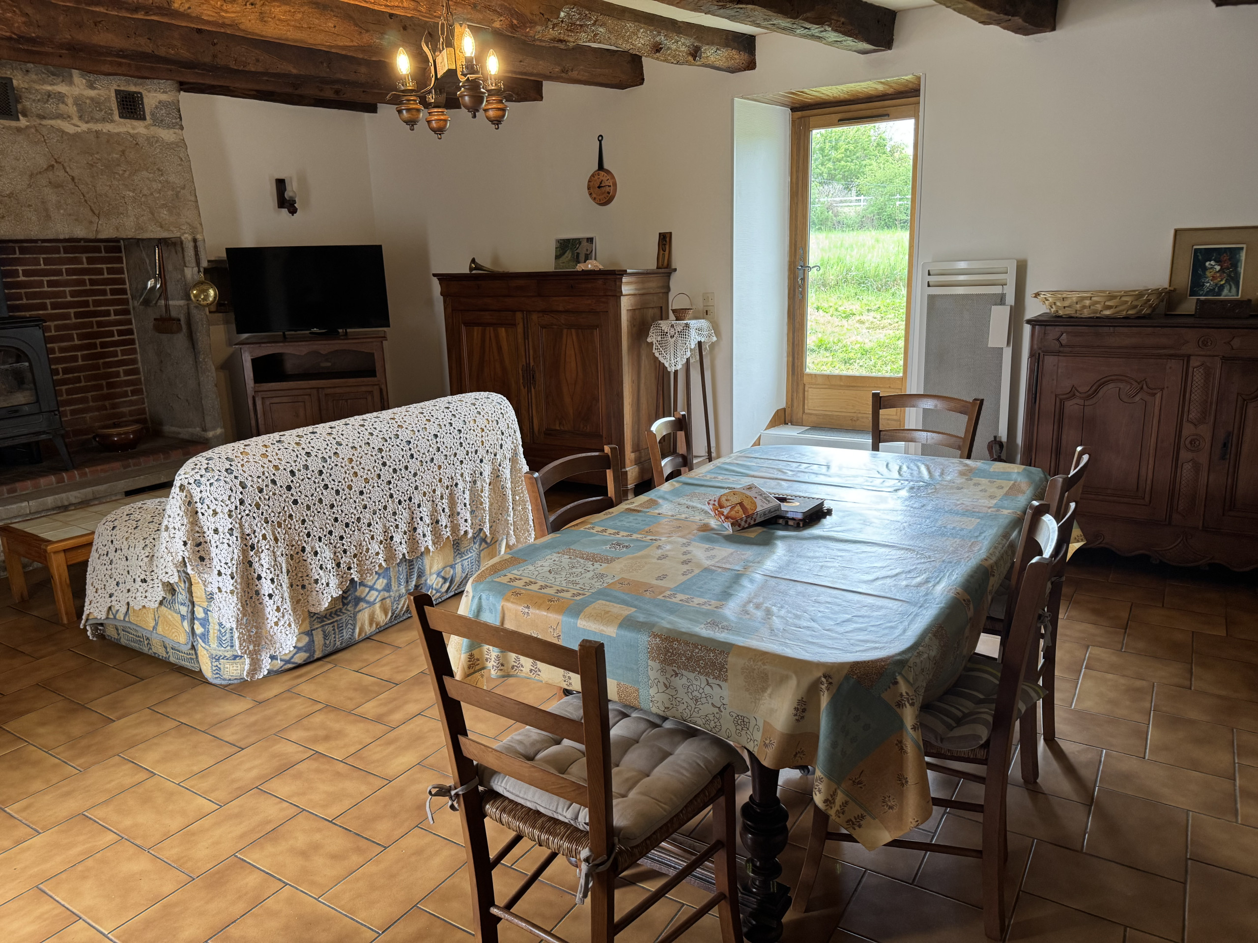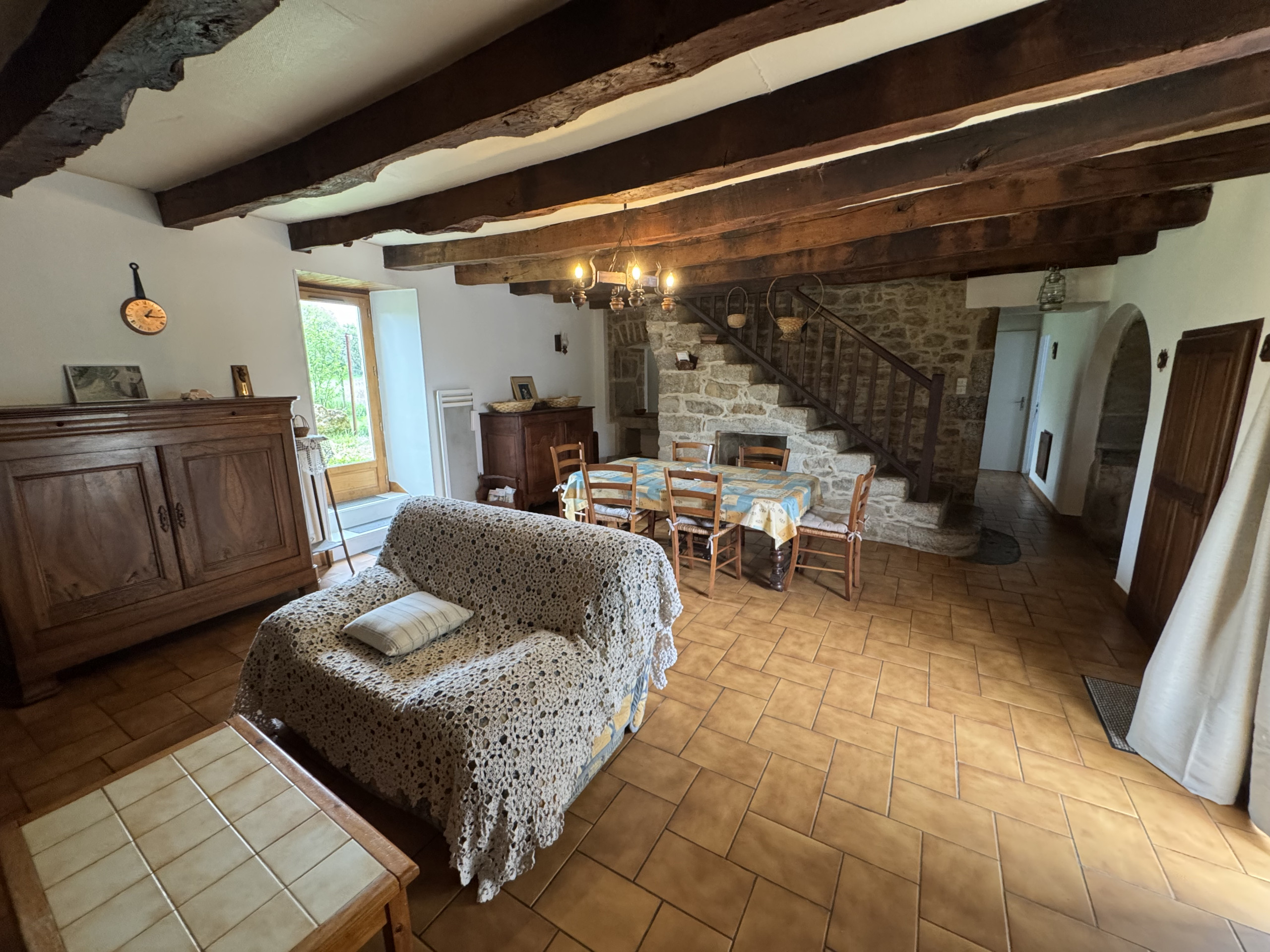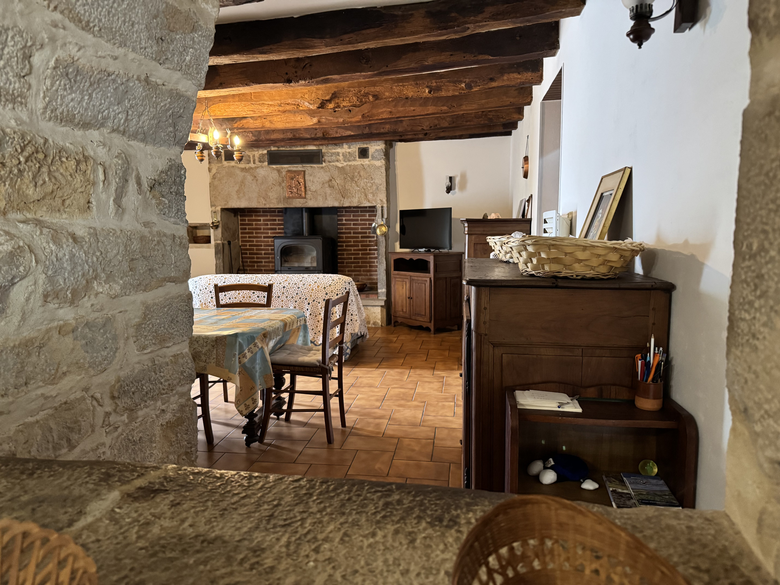 Vous apprécierez le séjour convivial avec ses murs en pierre apparente, ses poutres en bois et son escalier en pierre plein de charme. L’espace salon et salle à manger invite à la détente et aux moments partagés.