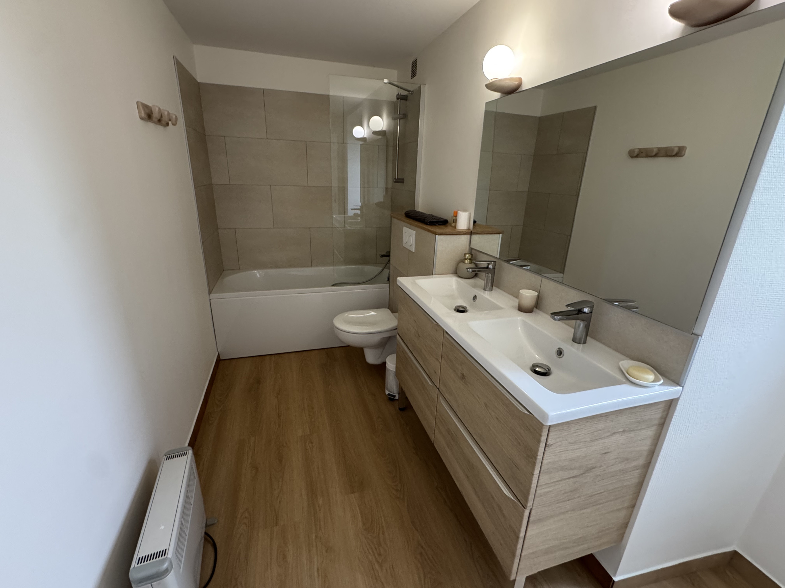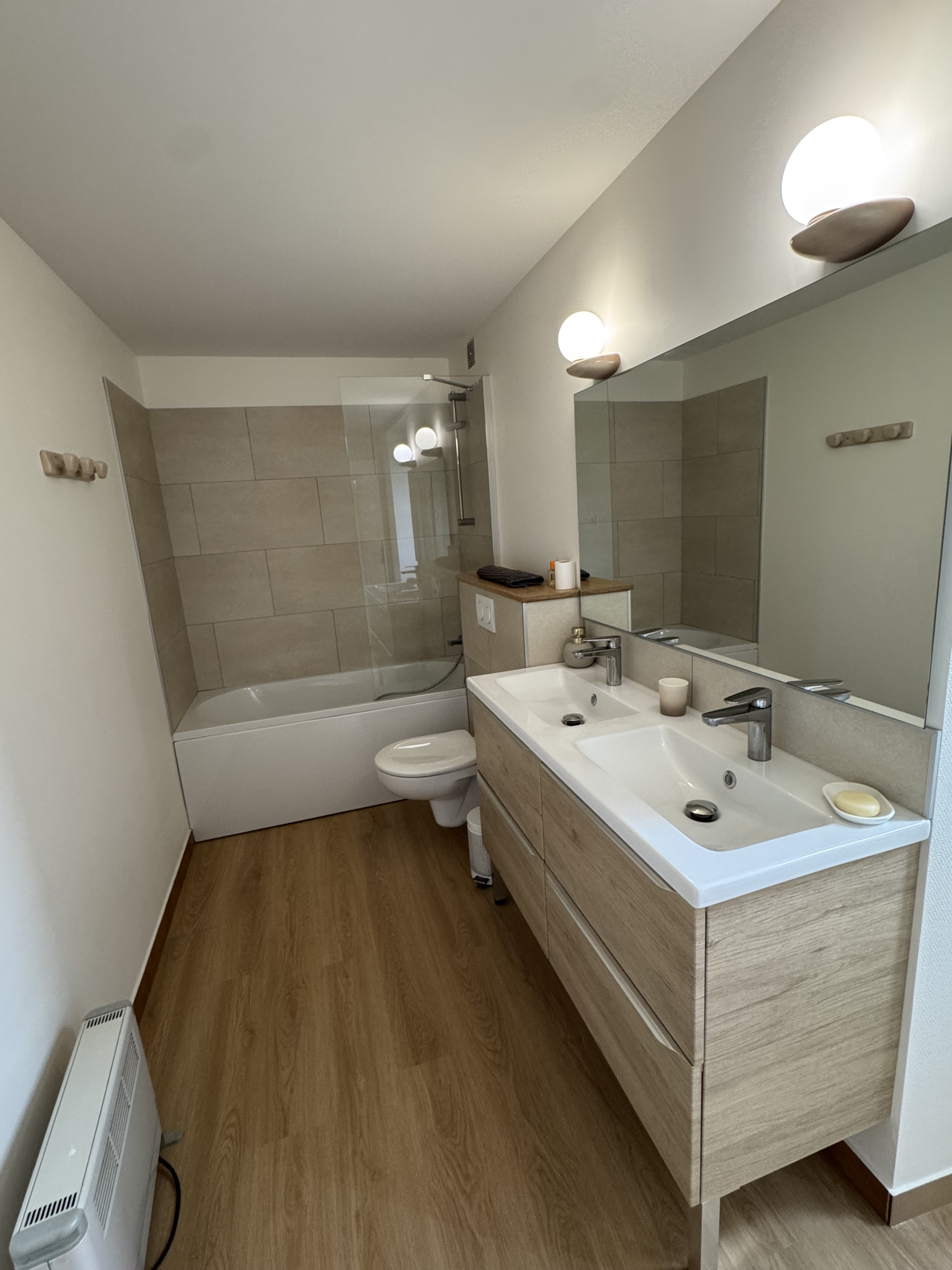 Le gîte dispose d’une salle de bain rénovée avec double vasque, baignoire et douche, pour allier charme de l’ancien et praticité.