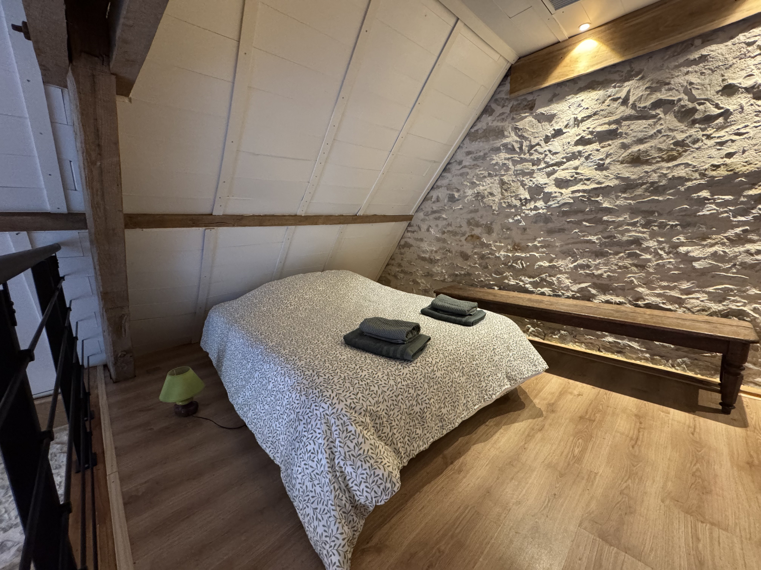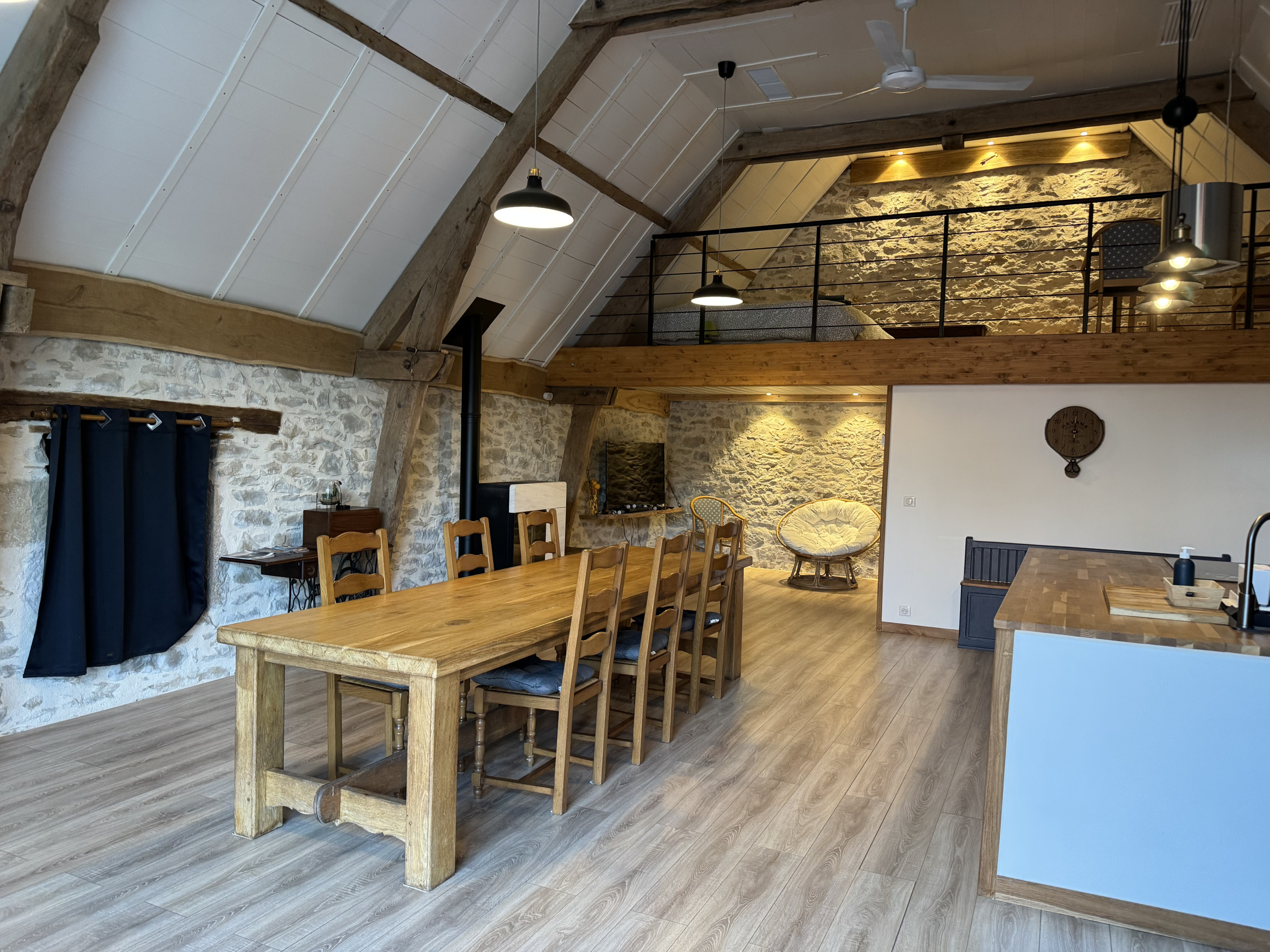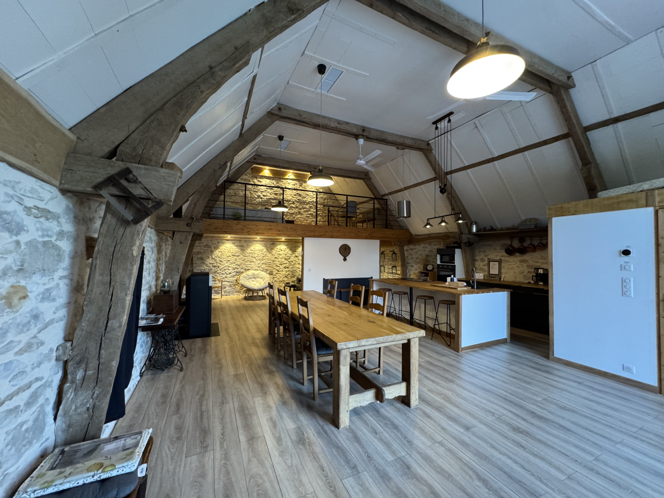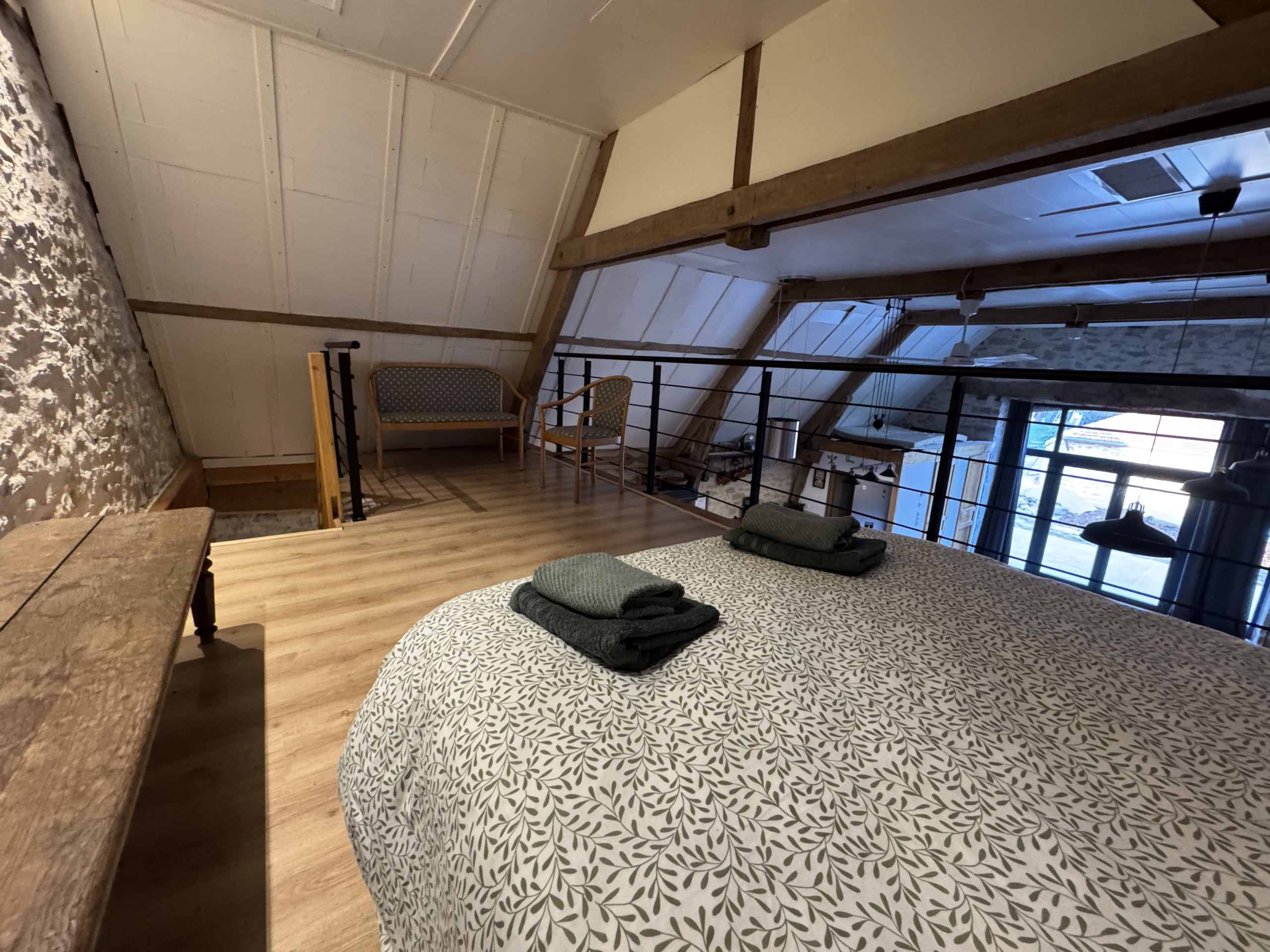 Au-dessus du séjour, une mezzanine ouverte accueille un lit double, offrant un espace supplémentaire pour dormir tout en conservant le volume et le caractère de la pièce principale.