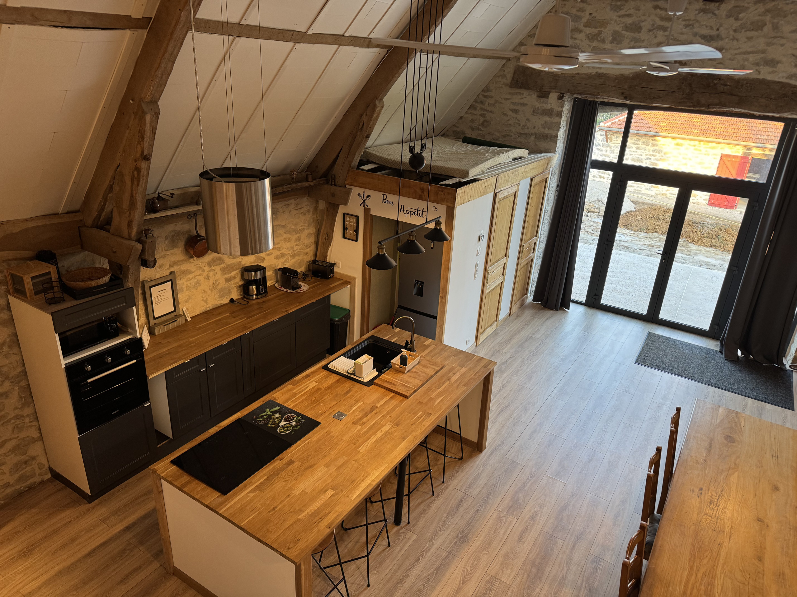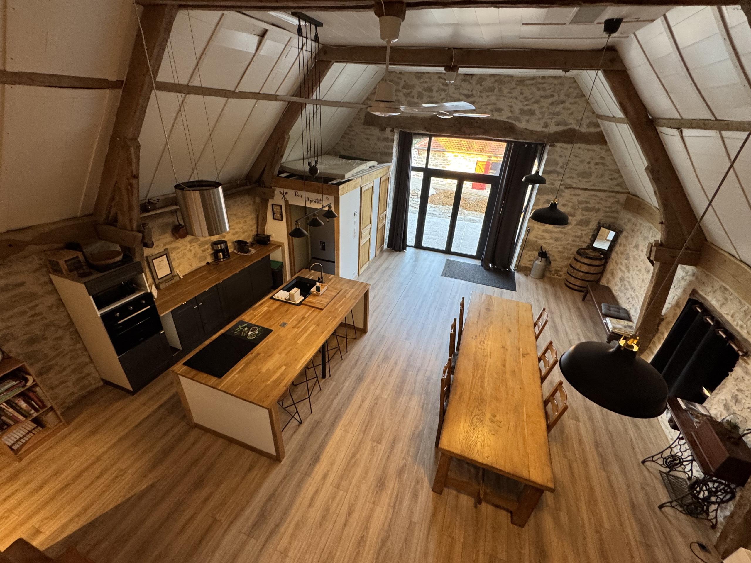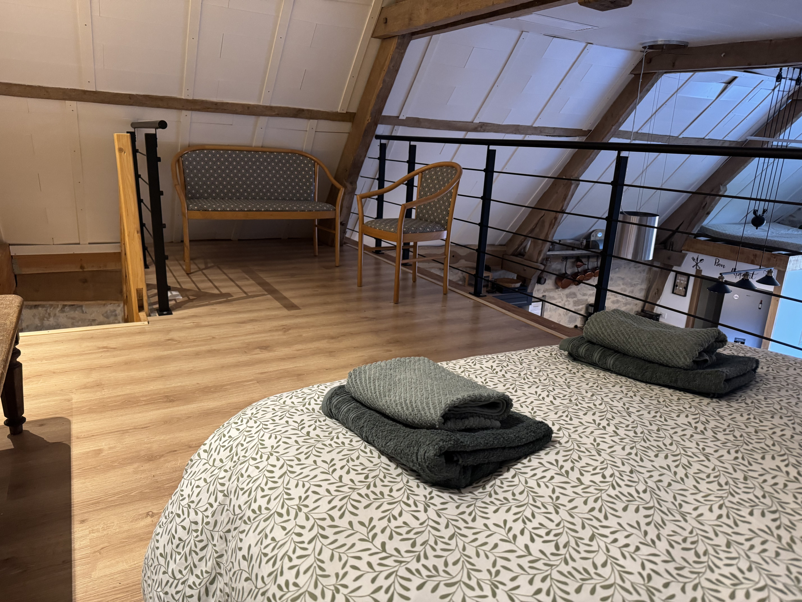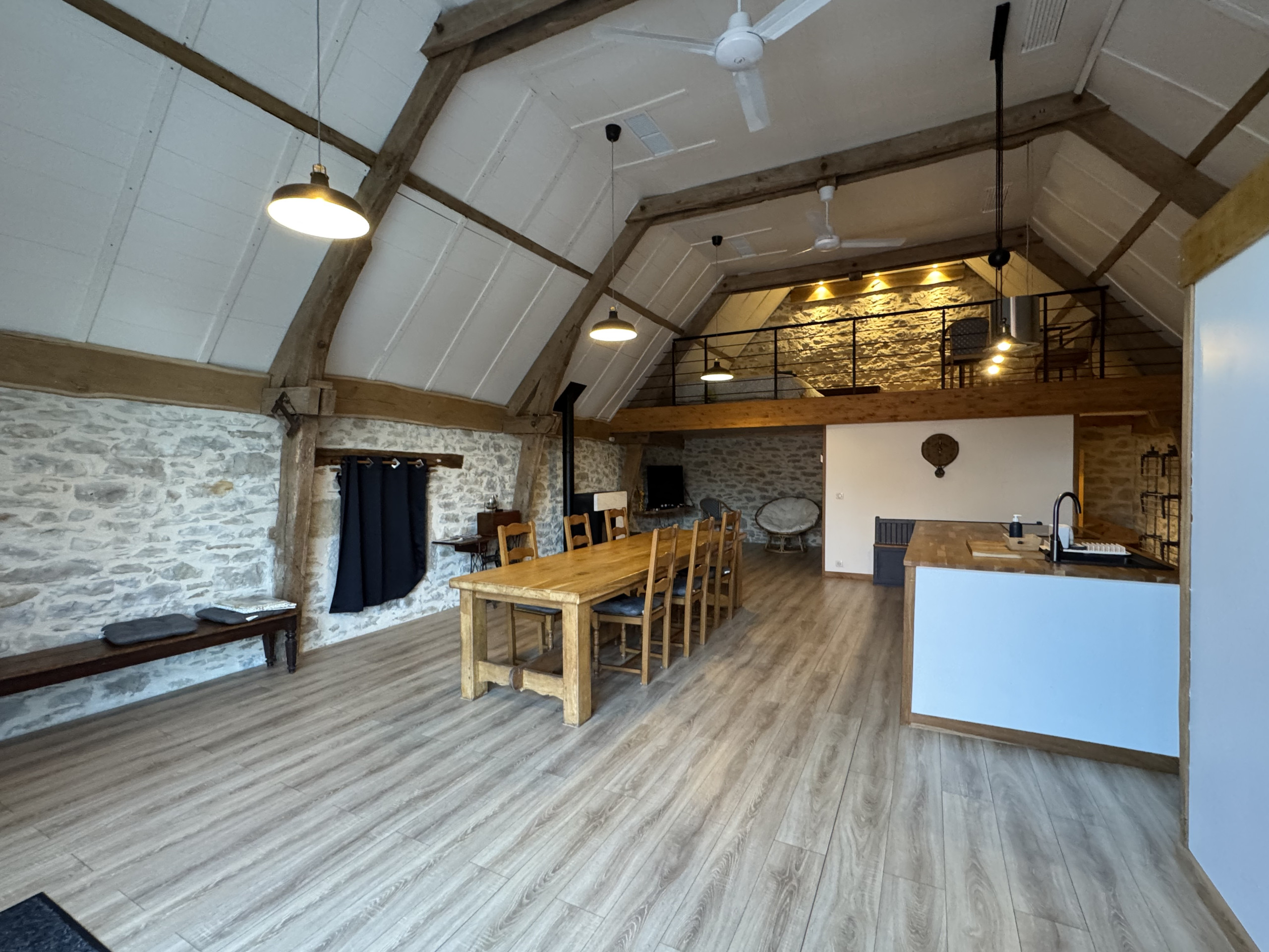 Au-dessus du séjour, une mezzanine ouverte accueille un lit double, offrant un espace supplémentaire pour dormir tout en conservant le volume et le caractère de la pièce principale.
